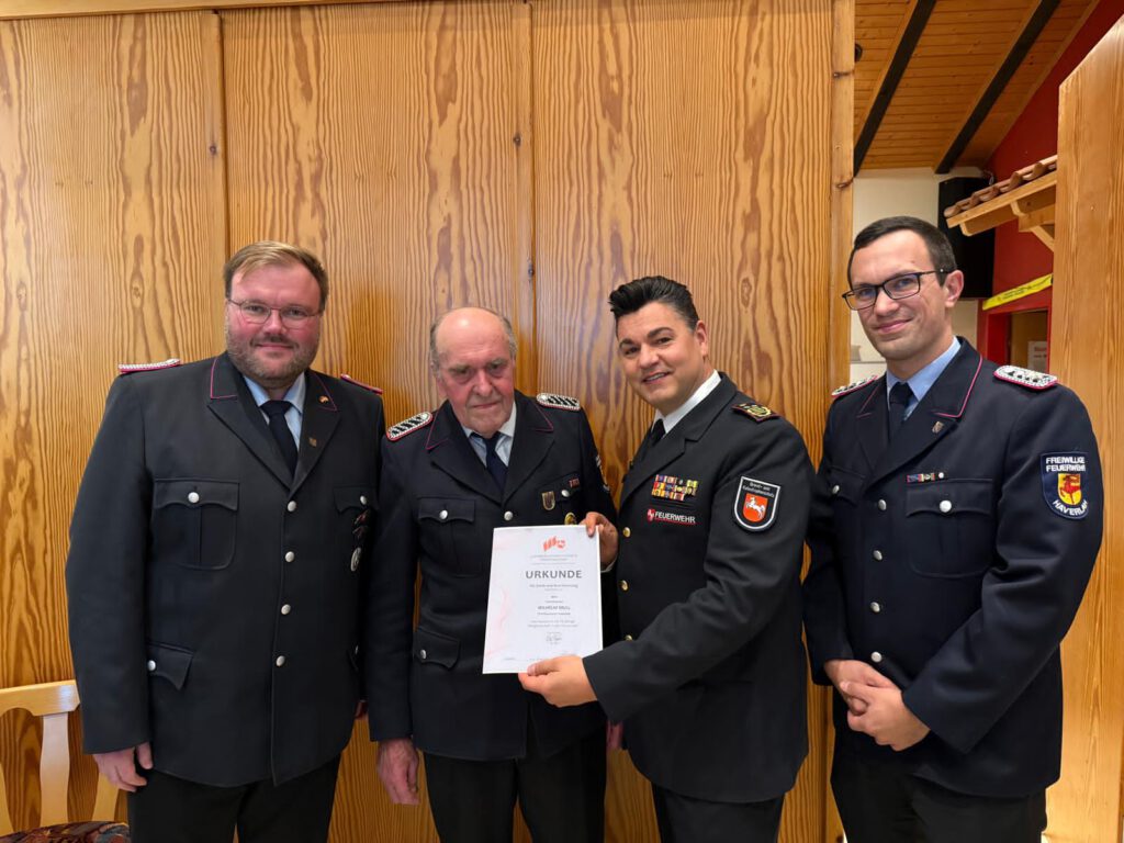 Eine ganz besondere Ehrung bildete den Höhepunkt der Versammlung: Nach einer Laudatio durch den Ortbrandmeister René Weniger überreichte Regierungsbrandmeister Tobias Thurau dem Ehrenmitglied Wilhelm Mull die Ehrenurkunde für beeindruckende 75 Jahre Dienst in der Feuerwehr Haverlah – ein außergewöhnliches Zeichen jahrzehntelangen Engagements und gelebter Kameradschaft.