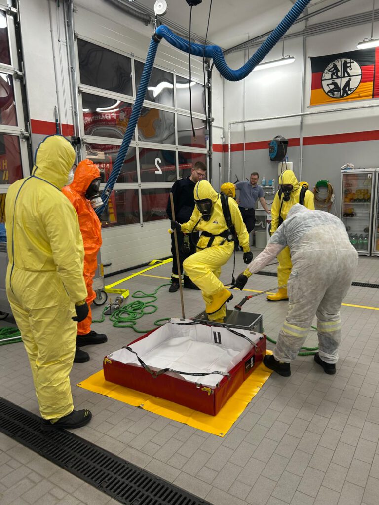 Ein weiterer Schwerpunkt des praktischen Übungsdienstes war die gründliche Reinigung der kontaminierten Einsatzkräfte. Hierbei zeigte sich, dass insbesondere Übergangsbereiche wie Handschuhe, Stiefel, Ärmel- und Hosenabschlüsse sowie schwer zugängliche Stellen eine besondere Herausforderung darstellen. Auch das kontrollierte Ablegen der persönlichen Schutzausrüstung erwies sich als kritisch, da hierbei eine erneute Kontamination schnell erfolgen kann. Die Übung machte deutlich, wie wichtig ein strukturierter Ablauf, gegenseitige Kontrolle und ausreichende Zeit für eine sorgfältige Dekontamination sind, um die Verschleppung von Schadstoffen sicher zu vermeiden.